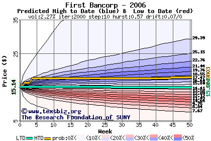 The high to date and low to date prices of the stock plotted against a random walk model for 2006 (what's this?).