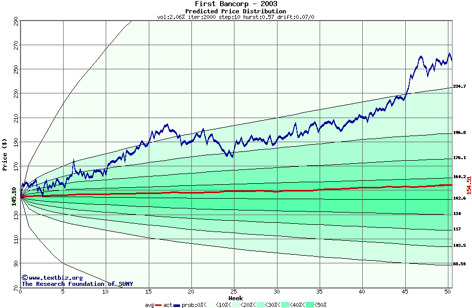 The following graph plots the year-to-date performance of the stock for 2003 compared to the probability calculated by a random walk model.
