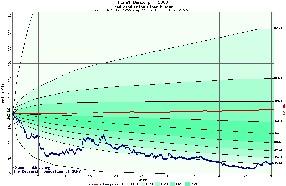 The following graph plots the year-to-date performance of the stock for 2009 compared to the probability calculated by a random walk model.
