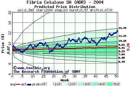 The high to date and low to date prices of the stock plotted against a random walk model for 2004 (what's this?).