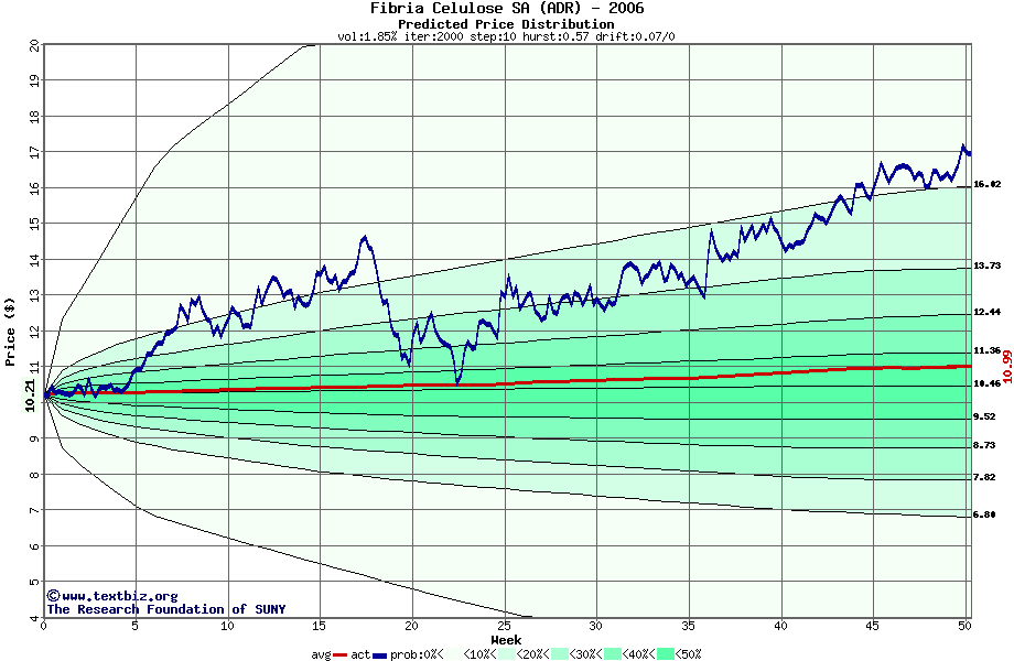 The following graph plots the year-to-date performance of the stock for 2006 compared to the probability calculated by a random walk model.