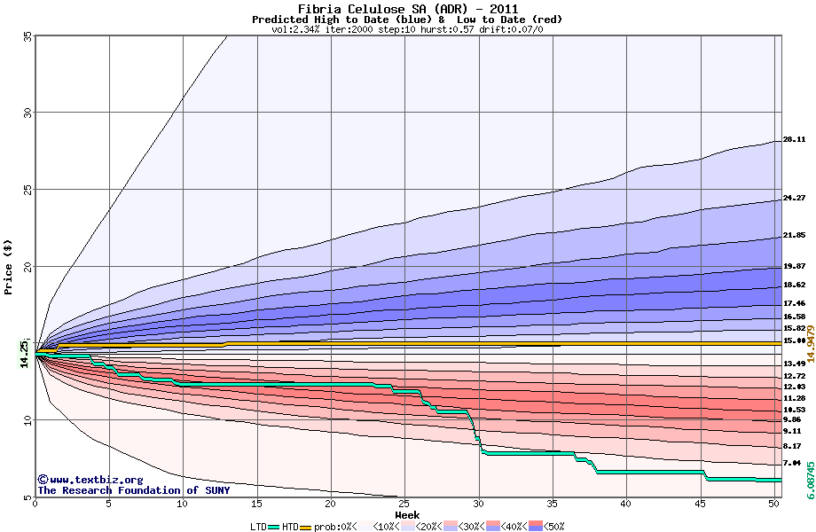 The high to date and low to date prices of the stock plotted against a random walk model for 2011 (what's this?).