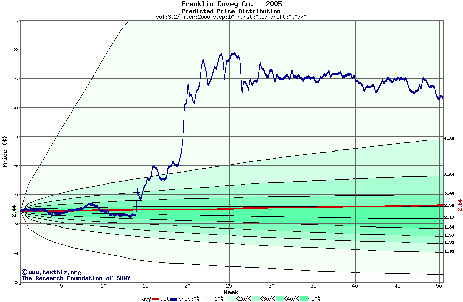 The following graph plots the year-to-date performance of the stock for 2005 compared to the probability calculated by a random walk model.