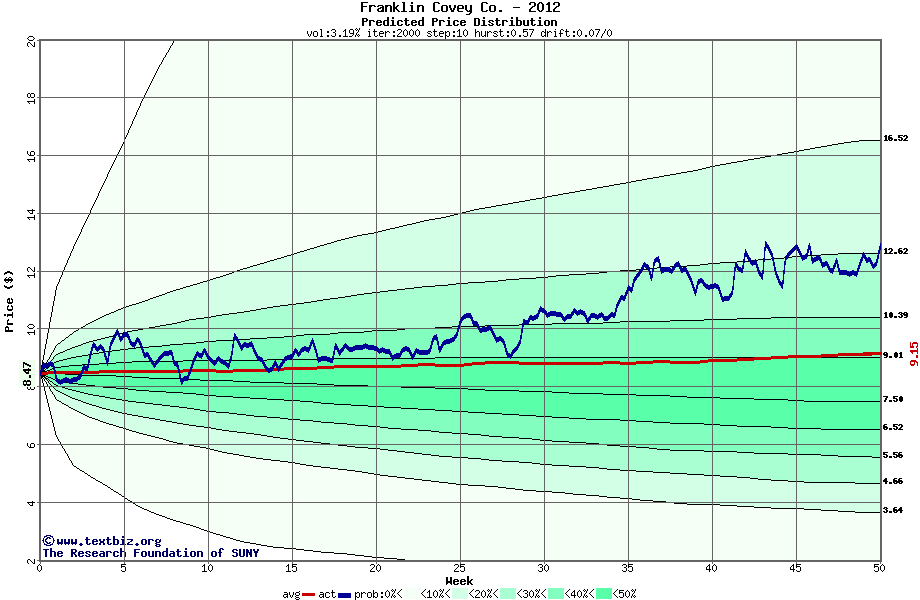 The following graph plots the year-to-date performance of the stock for 2012 compared to the probability calculated by a random walk model.