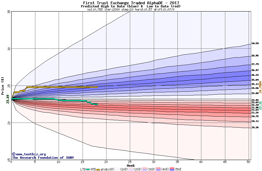 The following graph plots the year-to-date performance of the stock for 2017 compared to the probability calculated by a random walk model.
