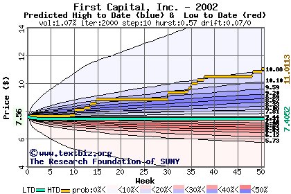 The high to date and low to date prices of the stock plotted against a random walk model for 2002 (what's this?).