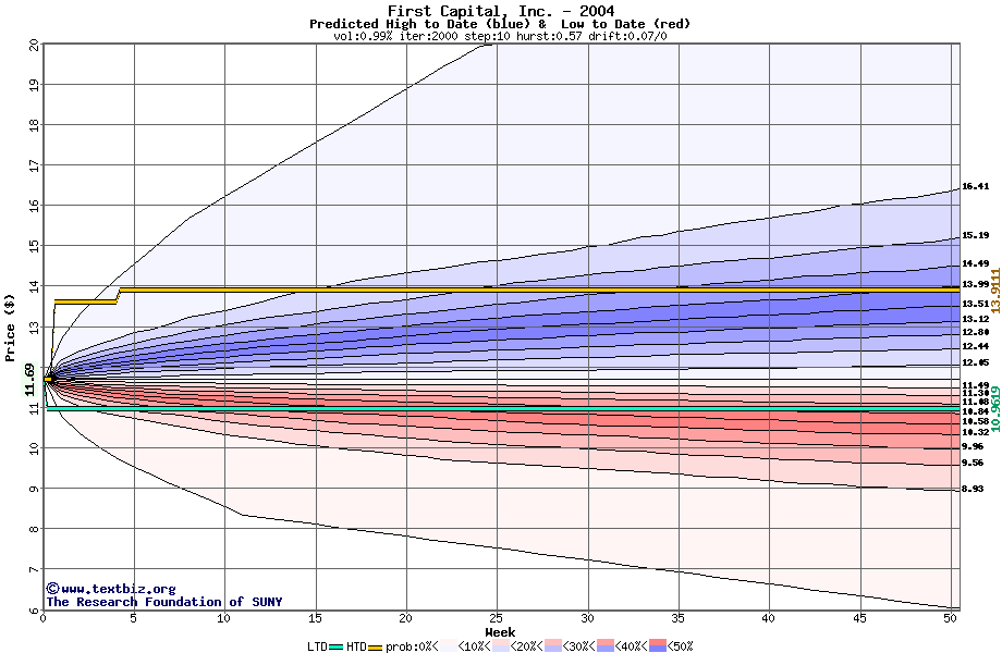 The high to date and low to date prices of the stock plotted against a random walk model for 2004 (what's this?).