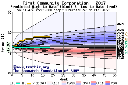 The high to date and low to date prices of the stock plotted against a random walk model for 2017 (what's this?).