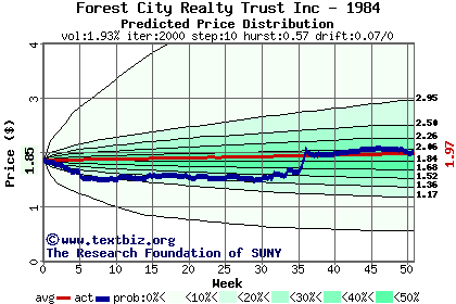 The high to date and low to date prices of the stock plotted against a random walk model for 1984 (what's this?).
