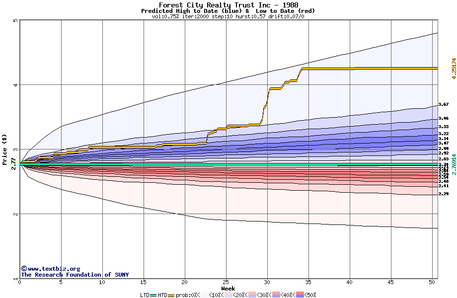 The following graph plots the year-to-date performance of the stock for 1988 compared to the probability calculated by a random walk model.