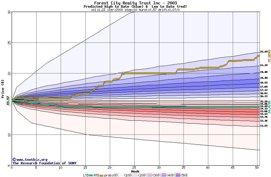 The high to date and low to date prices of the stock plotted against a random walk model for 2003 (what's this?).