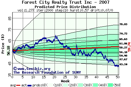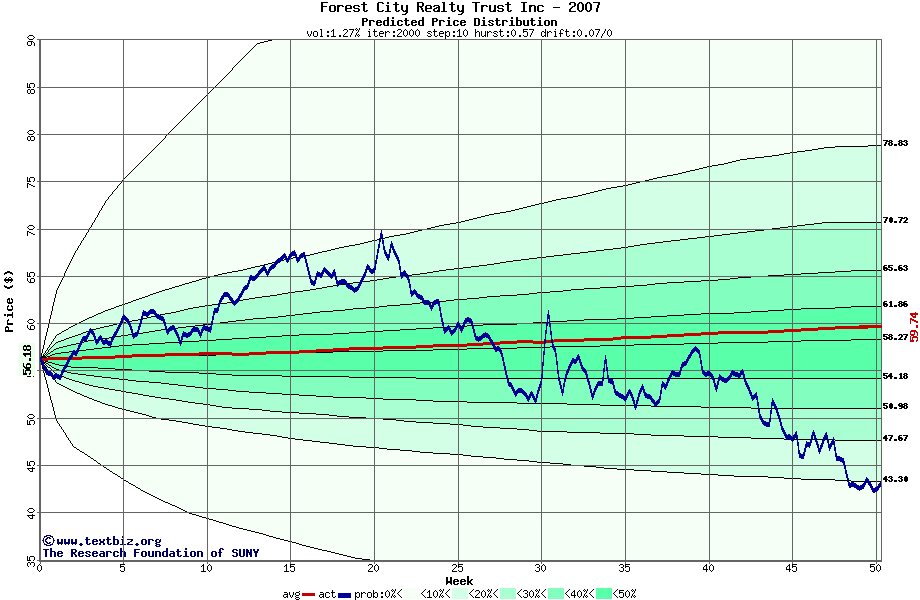 The following graph plots the year-to-date performance of the stock for 2007 compared to the probability calculated by a random walk model.