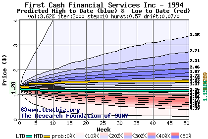 The high to date and low to date prices of the stock plotted against a random walk model for 1994 (what's this?).