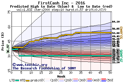 The high to date and low to date prices of the stock plotted against a random walk model for 2016 (what's this?).