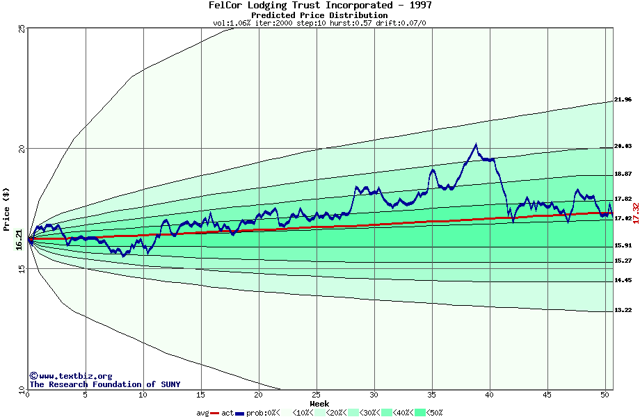 The following graph plots the year-to-date performance of the stock for 1997 compared to the probability calculated by a random walk model.