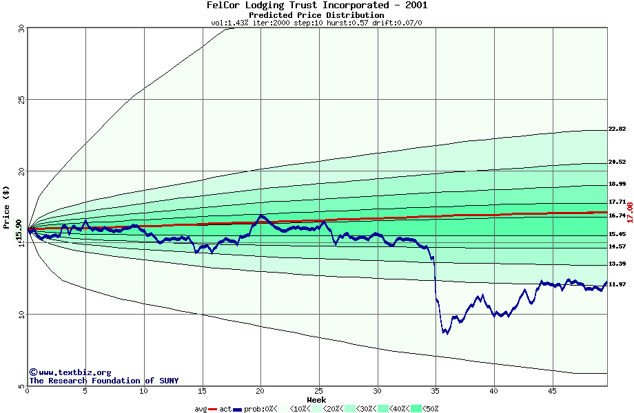 The following graph plots the year-to-date performance of the stock for 2001 compared to the probability calculated by a random walk model.