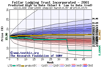 The high to date and low to date prices of the stock plotted against a random walk model for 2001 (what's this?).