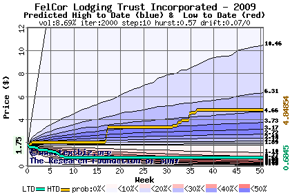 The high to date and low to date prices of the stock plotted against a random walk model for 2009 (what's this?).