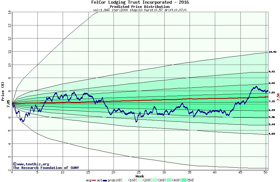 The following graph plots the year-to-date performance of the stock for 2016 compared to the probability calculated by a random walk model.