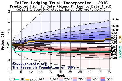 The high to date and low to date prices of the stock plotted against a random walk model for 2016 (what's this?).