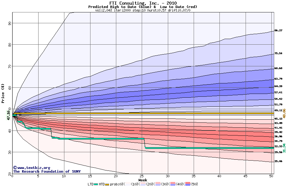 The high to date and low to date prices of the stock plotted against a random walk model for 2010 (what's this?).