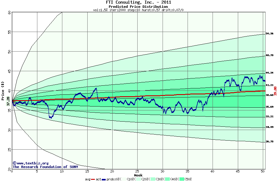 The following graph plots the year-to-date performance of the stock for 2011 compared to the probability calculated by a random walk model.