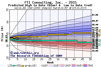 The high to date and low to date prices of the stock plotted against a random walk model for 2015 (what's this?).