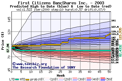 The high to date and low to date prices of the stock plotted against a random walk model for 2003 (what's this?).