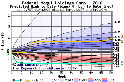 The high to date and low to date prices of the stock plotted against a random walk model for 2016 (what's this?).