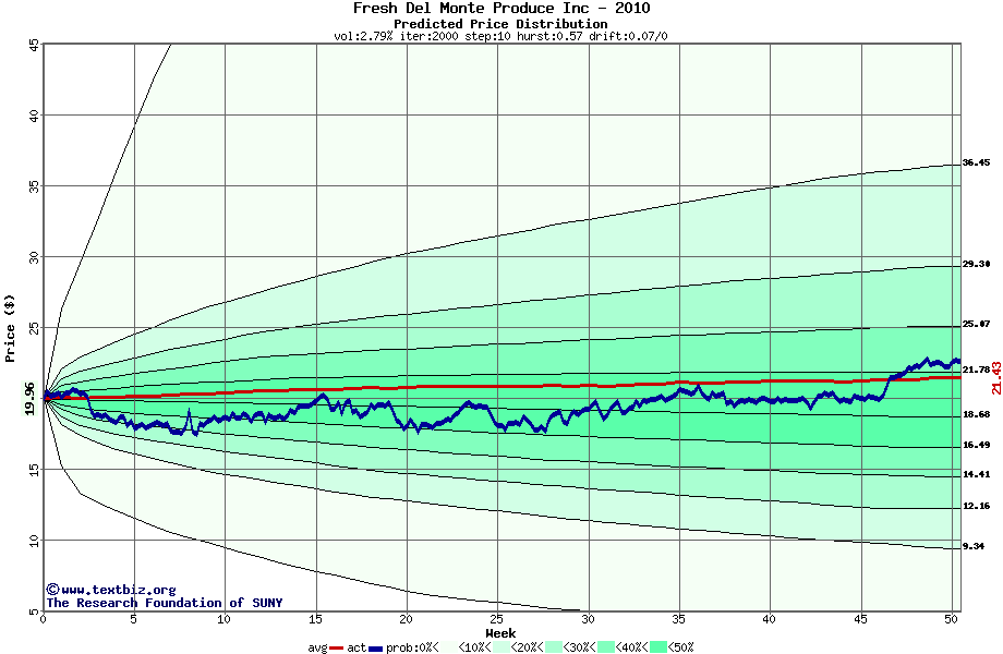 The following graph plots the year-to-date performance of the stock for 2010 compared to the probability calculated by a random walk model.