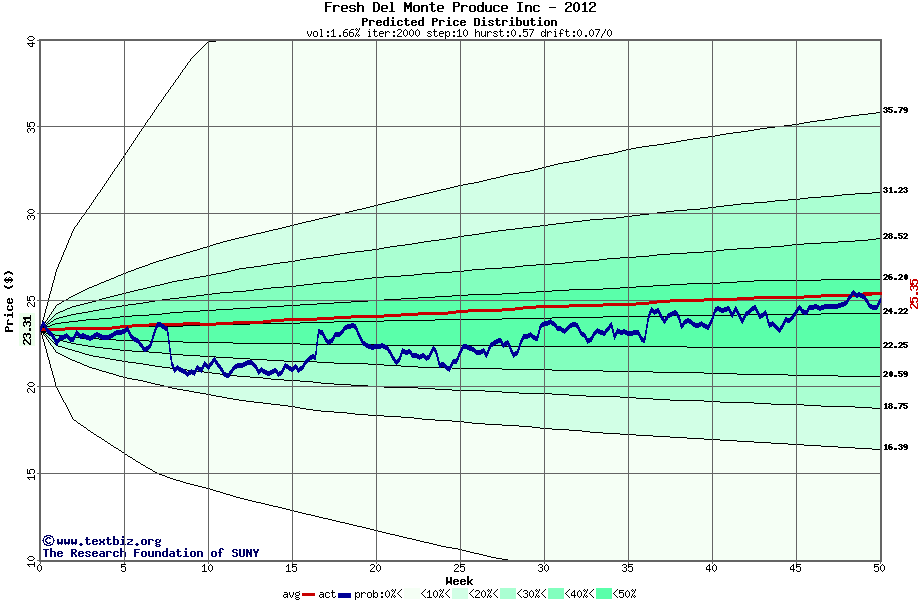 The following graph plots the year-to-date performance of the stock for 2012 compared to the probability calculated by a random walk model.