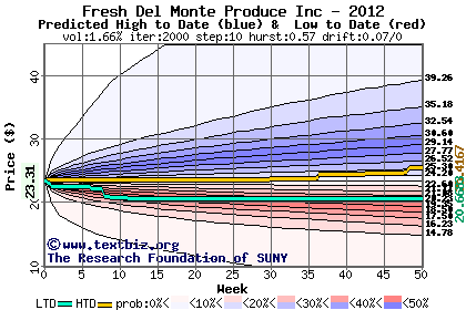 The high to date and low to date prices of the stock plotted against a random walk model for 2012 (what's this?).