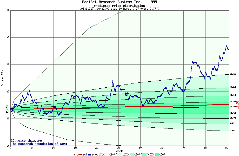 The following graph plots the year-to-date performance of the stock for 1999 compared to the probability calculated by a random walk model.