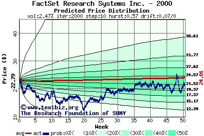 The high to date and low to date prices of the stock plotted against a random walk model for 2000 (what's this?).