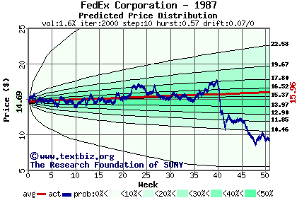 The high to date and low to date prices of the stock plotted against a random walk model for 1987 (what's this?).