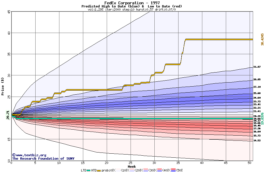 The high to date and low to date prices of the stock plotted against a random walk model for 1997 (what's this?).