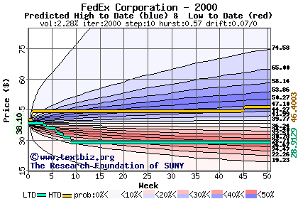 The high to date and low to date prices of the stock plotted against a random walk model for 2000 (what's this?).
