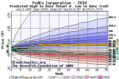 The high to date and low to date prices of the stock plotted against a random walk model for 2010 (what's this?).
