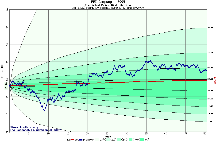 The following graph plots the year-to-date performance of the stock for 2009 compared to the probability calculated by a random walk model.