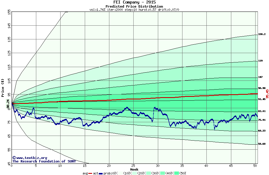 The following graph plots the year-to-date performance of the stock for 2015 compared to the probability calculated by a random walk model.