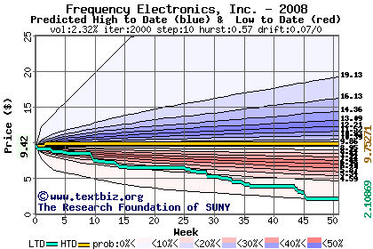 The high to date and low to date prices of the stock plotted against a random walk model for 2008 (what's this?).