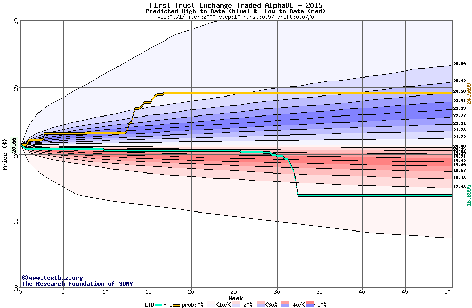 The high to date and low to date prices of the stock plotted against a random walk model for 2015 (what's this?).
