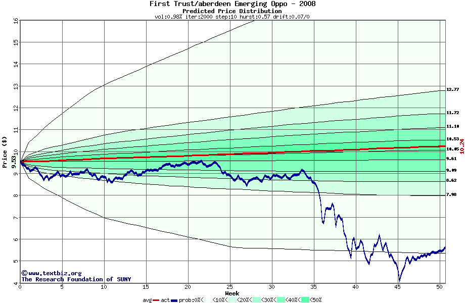 The following graph plots the year-to-date performance of the stock for 2008 compared to the probability calculated by a random walk model.