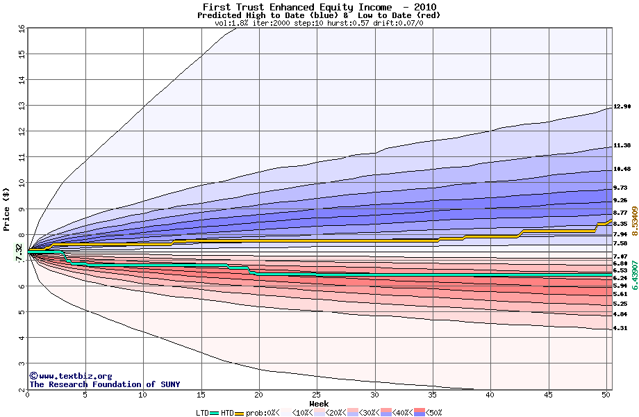 The high to date and low to date prices of the stock plotted against a random walk model for 2010 (what's this?).
