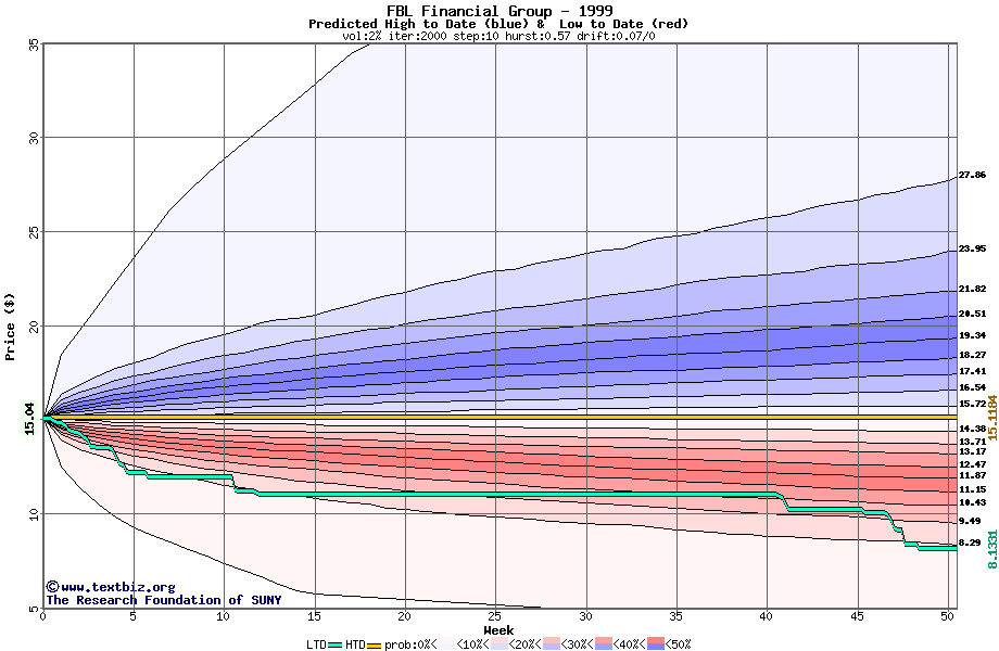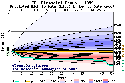 The high to date and low to date prices of the stock plotted against a random walk model for 1999 (what's this?).