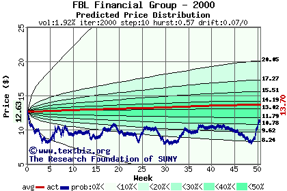 The high to date and low to date prices of the stock plotted against a random walk model for 2000 (what's this?).