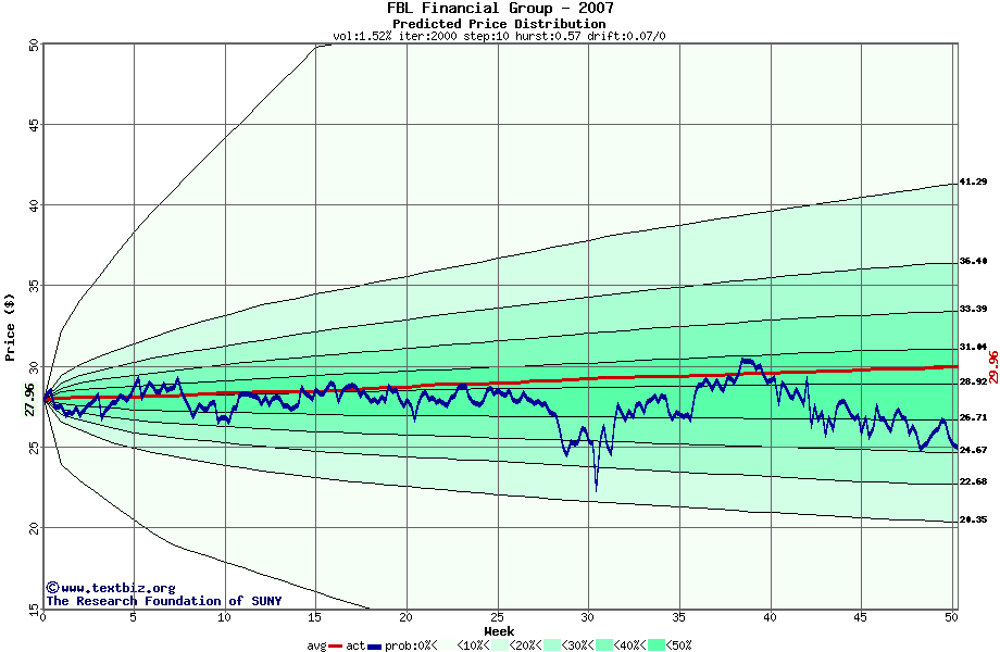 The following graph plots the year-to-date performance of the stock for 2007 compared to the probability calculated by a random walk model.
