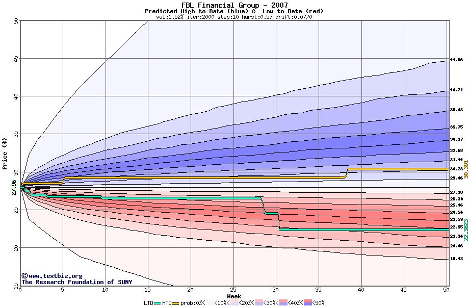 The high to date and low to date prices of the stock plotted against a random walk model for 2007 (what's this?).