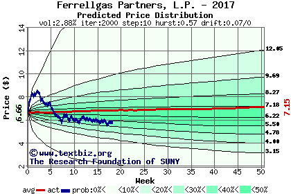The high to date and low to date prices of the stock plotted against a random walk model for 2017 (what's this?).