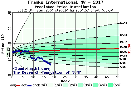 The high to date and low to date prices of the stock plotted against a random walk model for 2017 (what's this?).